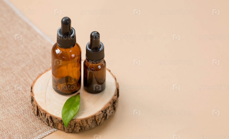 Натуральная органическая экокосметика. Макет брендинга салона красоты. Стеклянная бутылка-капельница на деревянной подставке на бежевом фоне