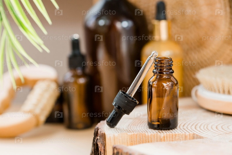 На деревянной подставке стояла стеклянная бутылка с пипеткой для масла и массажная щетка. Натуральная органическая экокосметика. Макет брендинга салона красоты. Ароматерапия