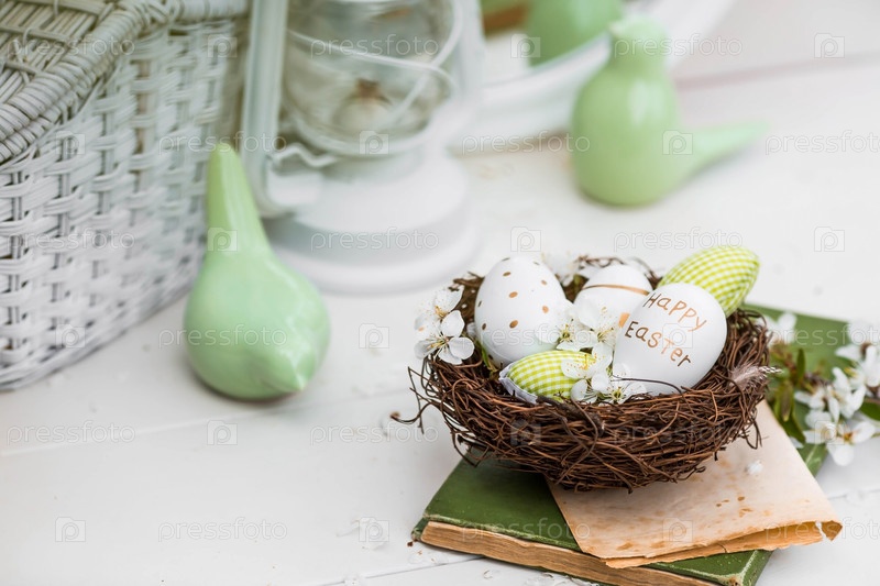 Баннер. Бело-зеленые яйца, вишневые цветы в гнезде, старая книга и фарфоровые птицы на белом деревянном столе. Праздничная открытка на Пасху 2023 года в винтажном стиле