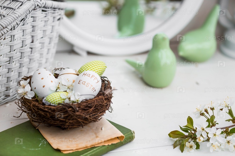 Баннер. Бело-зеленые яйца, вишневые цветы в гнезде, старая книга и фарфоровые птицы на белом деревянном столе. Праздничная открытка на Пасху 2023 года в винтажном стиле
