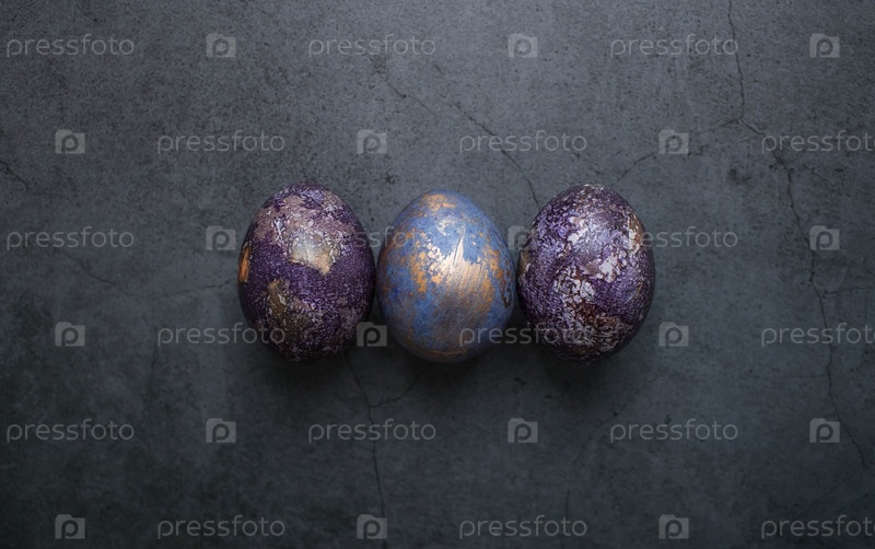 Пасхальная открытка с копией места для текста. Фиолетовые, синие и золотые яйца на темном фоне. Тенденция 2022 года – фиолетовый оттенок очень пери. Чай каркаде с натуральным красителем. Вид сверху