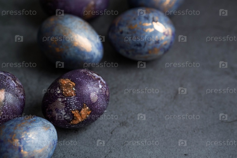 Пасхальная открытка с копией места для текста. Фиолетовые, синие и золотые яйца на темном фоне. Тенденция 2022 года – фиолетовый оттенок очень пери. Чай каркаде с натуральным красителем. Вид сверху