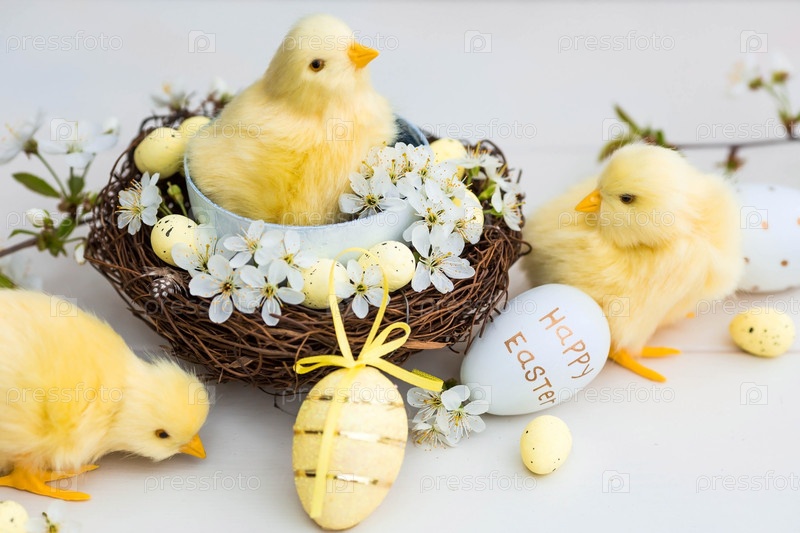 Золотые, желтые, белые яйца в птичьем гнезде, ветки сакуры и милые желтые цыплята на белом деревянном фоне. Минимальная концепция. Пасхальная открытка 2022 с копией места для текста