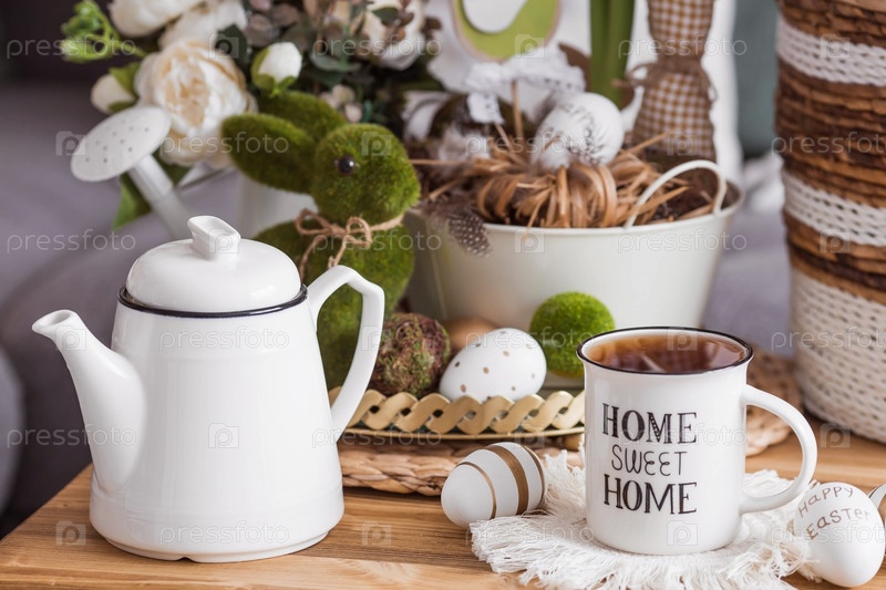 Пасхальное утро. Бело-зеленые цвета. Железные вазы с пасхальными яйцами, цветами, кроликом, чайником и чашкой в интерьере гостиной. Концепция домашнего уюта в светлый праздник Пасхи