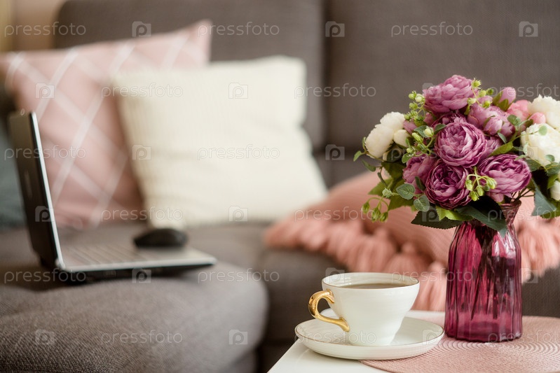 Работайте удаленно из дома. Компьютер на сером диване. Оставайтесь в безопасности дома. Дистанционное обучение, образование и работа. Заказать еду онлайн
