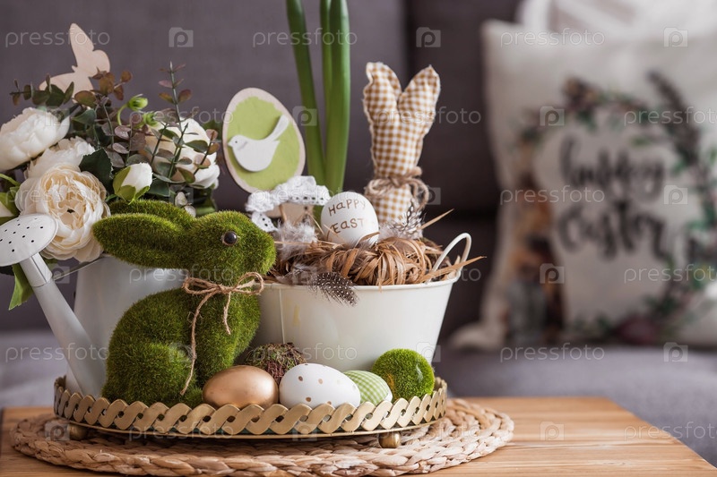 Деревенский. Бело-зеленые цвета. Железные кашпо с пасхальными яйцами, цветами, свечами и кроликами в интерьере гостиной на столе. Концепция домашнего уюта в светлый праздник Пасхи 2023
