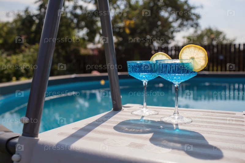 Стакан вкусного голубого коктейля Голубая лагуна и желтые лимоны на фоне бассейна. Алкогольный коктейль из сочных фруктов блю с ликером кюрасао, кубиками льда и долькой лимона