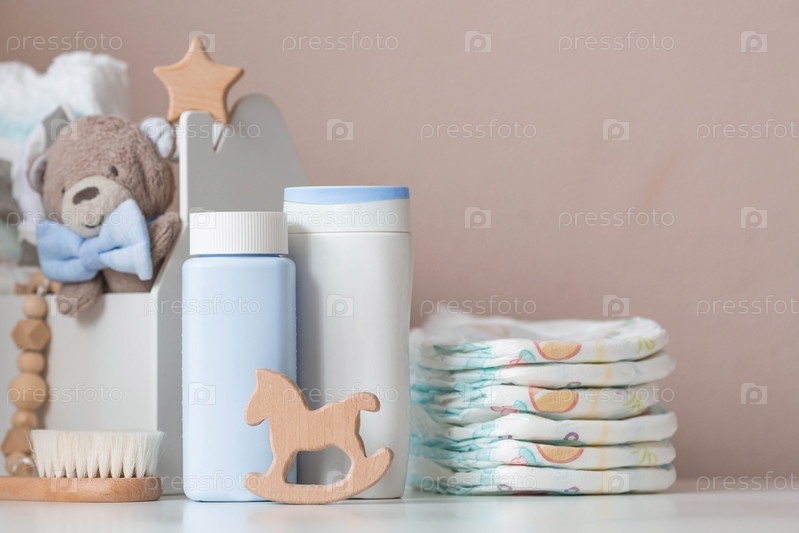 Деревянные игрушки, мишка в галстуке-бабочке, стопка подгузников, бутылочки без этикеток и детские принадлежности на пеленальном столике. Место для текста