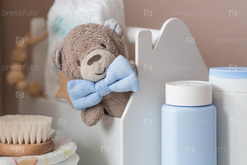 Деревянные игрушки, мишка в галстуке-бабочке, стопка подгузников, бутылочки без этикеток и детские принадлежности на пеленальном столике. Место для текста