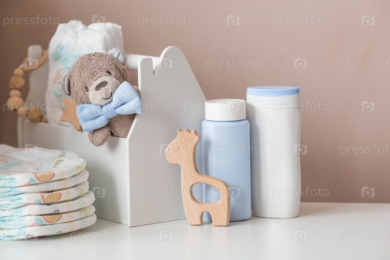 Деревянные игрушки, мишка в галстуке-бабочке, стопка подгузников, бутылочки без этикеток и детские принадлежности на пеленальном столике. Место для текста