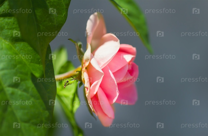 Муравей ползает по листу красивой розовой розы