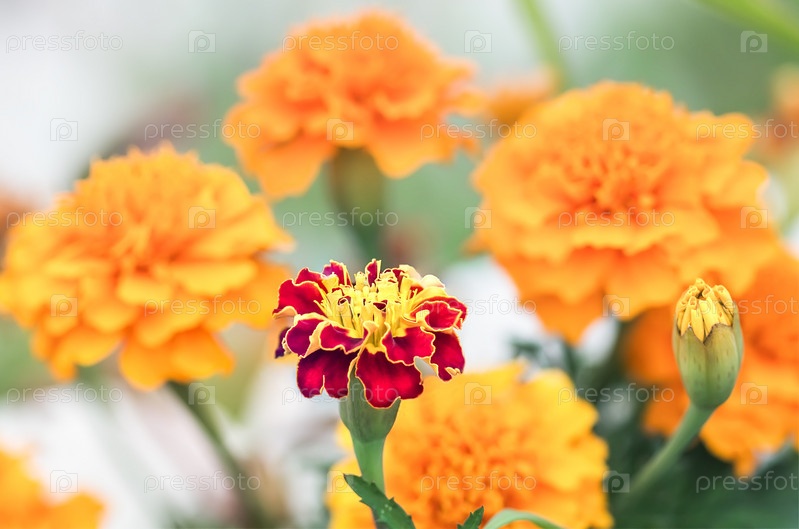 Красно-оранжевые цветочные головки Tagetes patula в саду