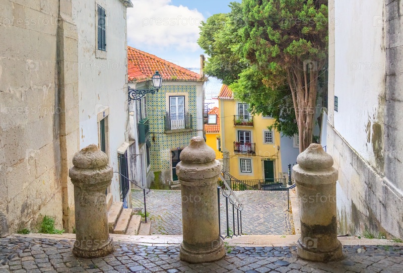 Небольшая улица с лестницей в Алфаме. Лиссабон, Португалия
