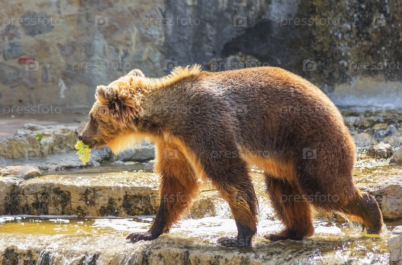 Бурый медведь играет у воды с листом капусты