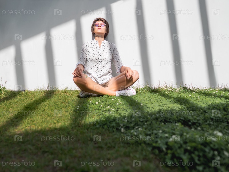 Женщина медитирует на лужайке в городском парке. Природа в городе. Отдохните на свежем воздухе после работы. Летние вибрации