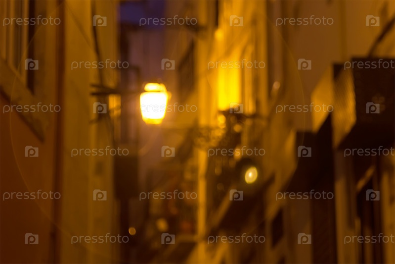 Фонарь светит ночью на маленькой улице. Лиссабон, Португалия