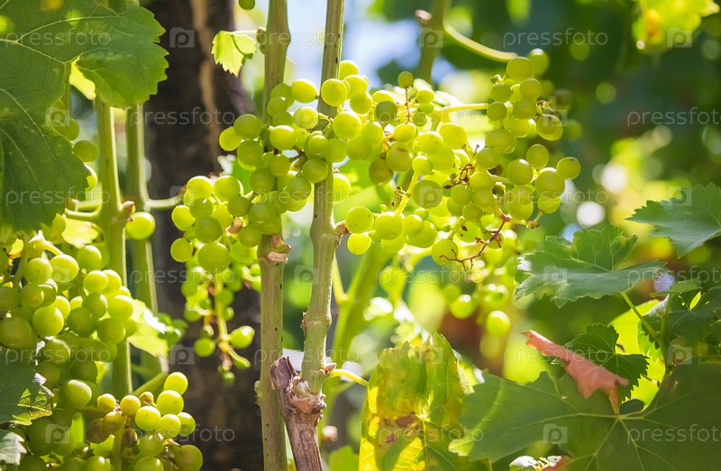 Белый виноград висит на кусте в саду