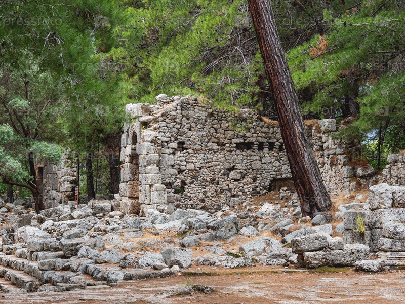 Руины Фазелиса, греческого и римского города на побережье древней Ликии. Архитектурная достопримечательность в районе Кемер провинции Анталья в Турции