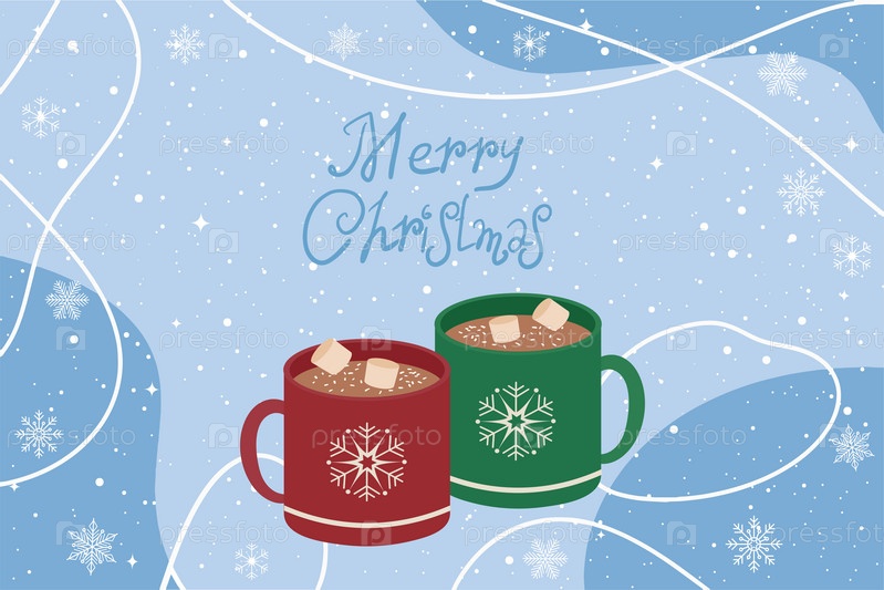 Горячий шоколад с зефиром. Чашка с орнаментом в виде снежинок и надписью «Счастливого Рождества». Векторная иллюстрация