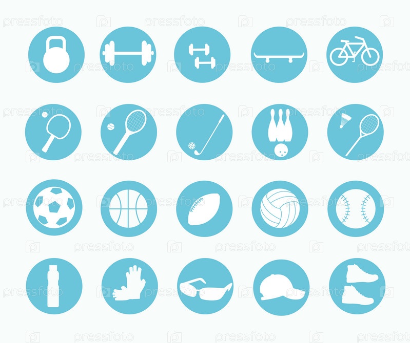 Набор спортивных круглых иконок. Коллекция из 20 векторных символов в кругах. Спортивное оборудование