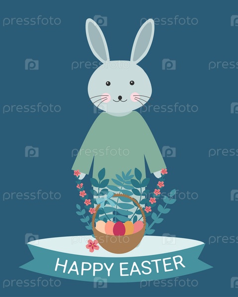 Счастливой Пасхи векторные иллюстрации. Пасхальный плакат с кроликом, корзиной, красочными яйцами и цветами. Изолированные на белом фоне