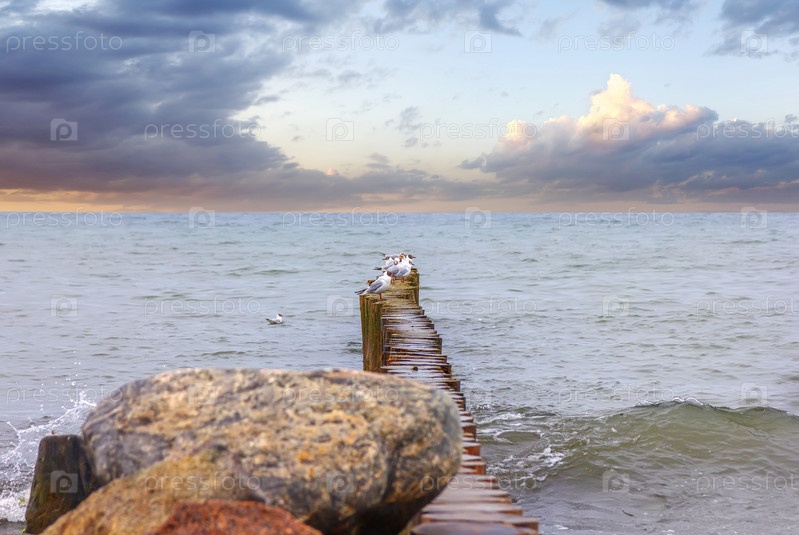 Чайки на деревянных шестах в Балтийском море. Зеленоградск. Россия