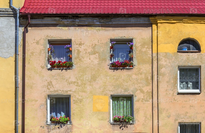 Окна с цветами на фасаде старого дома. Калининград, Россия