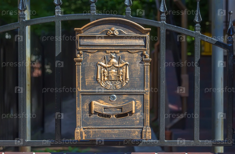 Винтажный почтовый ящик из меди или латуни на черном заборе