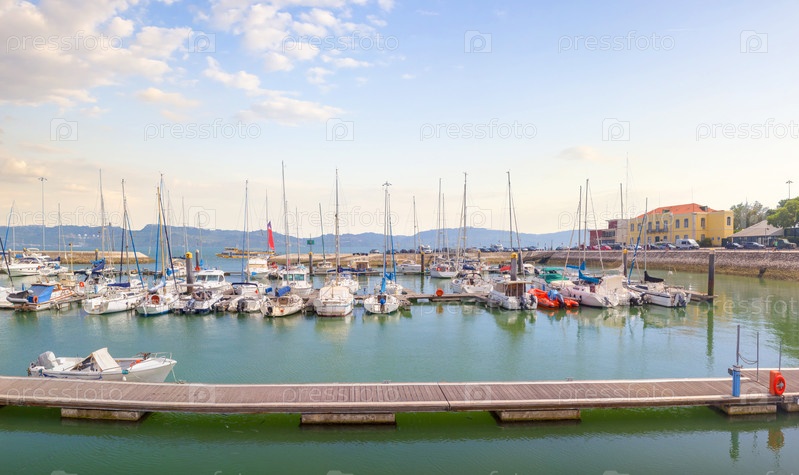 Яхты и катера в гавани на реке Тахо. Лиссабон, Португалия