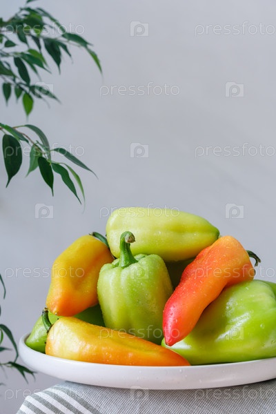 Сладкие перцы. Свежий урожай разноцветных перцев на тарелке на краю стола. Светлый фон. Капли воды