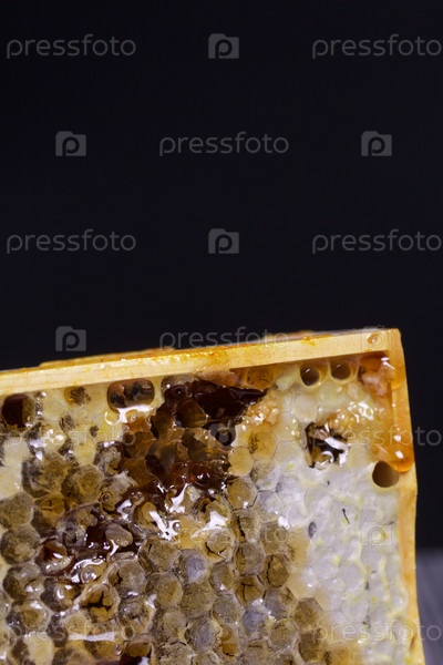 Мед в сотах в деревянной рамке. На черных сосновых досках. На черном фоне. Крупный план