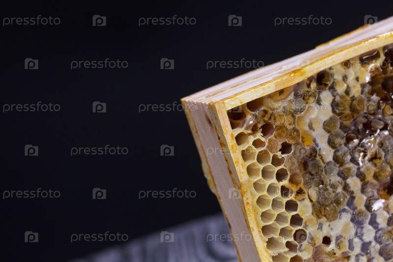 Мед в сотах в деревянной рамке. На черных сосновых досках. На черном фоне. Крупный план