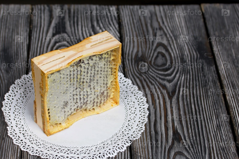 Мед в сотах в деревянной рамке. На черных сосновых досках. На черном фоне