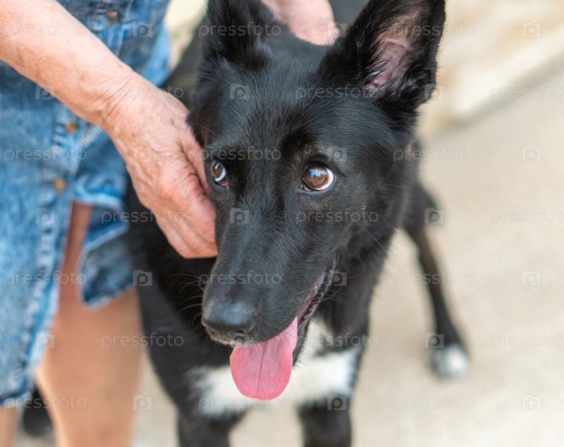 Черная собака крупным планом рядом с человеком