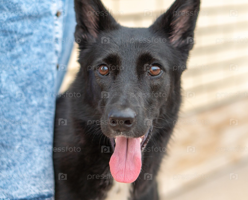 Черная собака крупным планом рядом с человеком