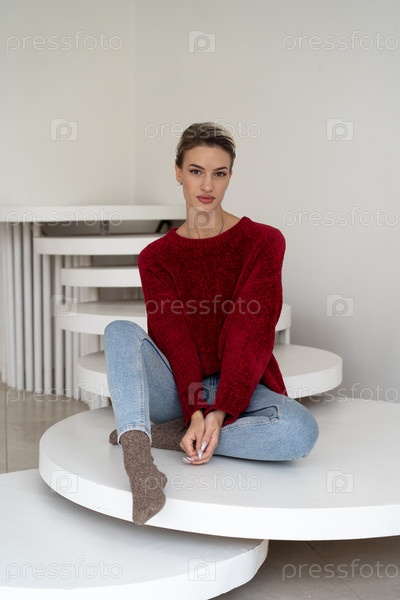 Молодая красивая женщина позирует в красном свитере в студии, сидя