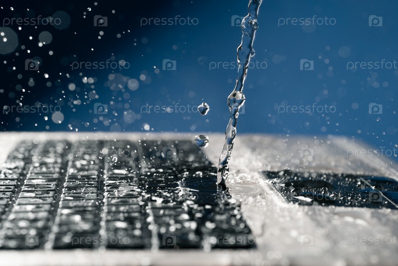 Поток воды льется на клавиатуру ноутбука