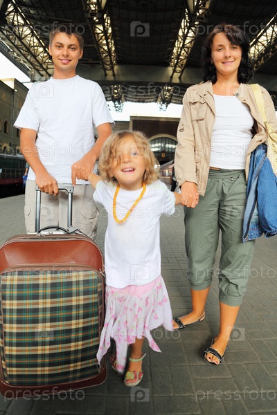 Счастливое семейство с дочкой на железнодорожном вокзале