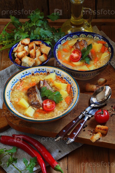 Гороховый суп с копчеными ребрами, сухарями на деревянном столе