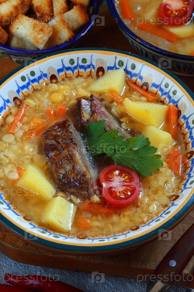 Гороховый суп с копчеными ребрами, сухарями на деревянном столе