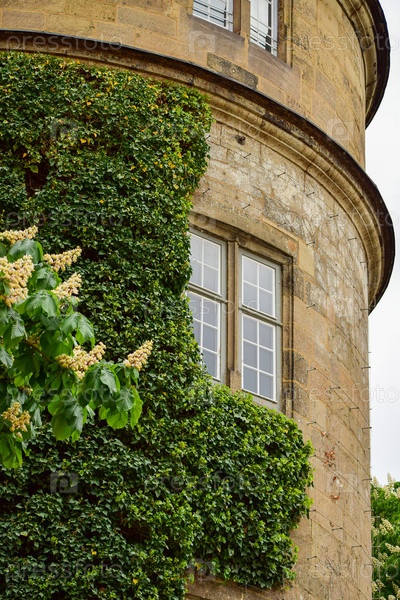 Фото старинной башни, стены которой увиты растением