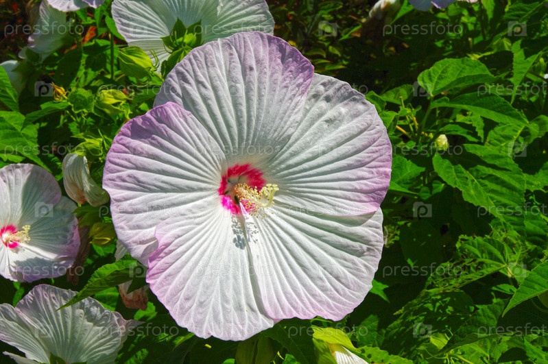 Цветок бело-синего гибискуса под ярким летним солнцем