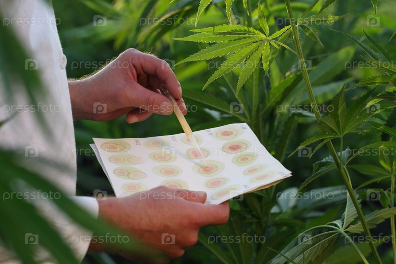 Ученый биолог работает в конопляном поле
