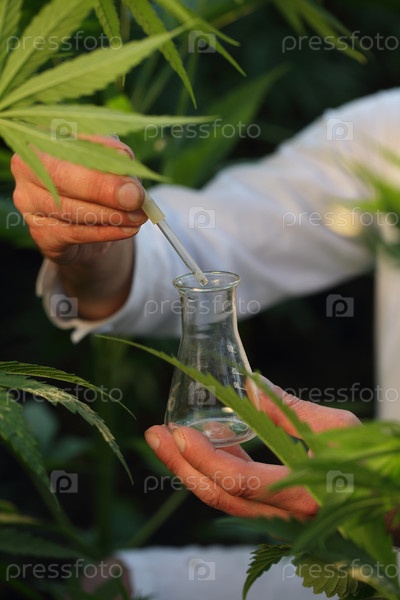 Ученый биолог работает в конопляном поле