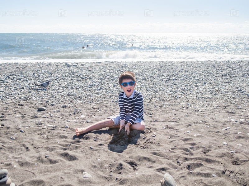 Счастливый мальчик строит пирамиду из мокрого песка, камней и коряг на галечном пляже. Отдых на море. Изучение природы в детстве