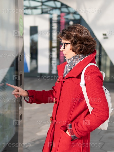 Кудрявая женщина в красном пальто прокручивает экран на внешнем электронном навигационном устройстве. Современные электронные панели на улицах для электронной коммерции или туристических карт