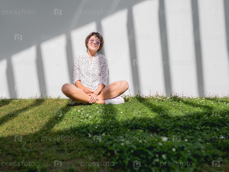 Улыбающаяся женщина в красочных солнцезащитных очках отдыхает на лужайке в городском парке. Природа в городе. Отдохните на свежем воздухе после работы. Летние вибрации