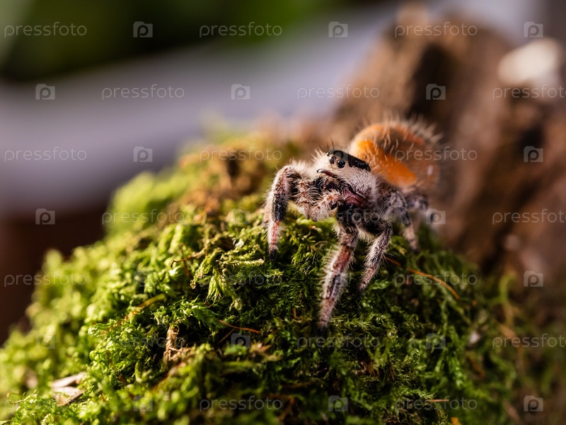 Крупным планом портрет паука тарантула. Большая волосатая паукообразная на зеленом мху
