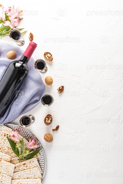 Вертикальный праздничный фон еврейской Пасхи с копией пространства. бутылка красного вина, серебряные бокалы с вином, маца, грецкие орехи