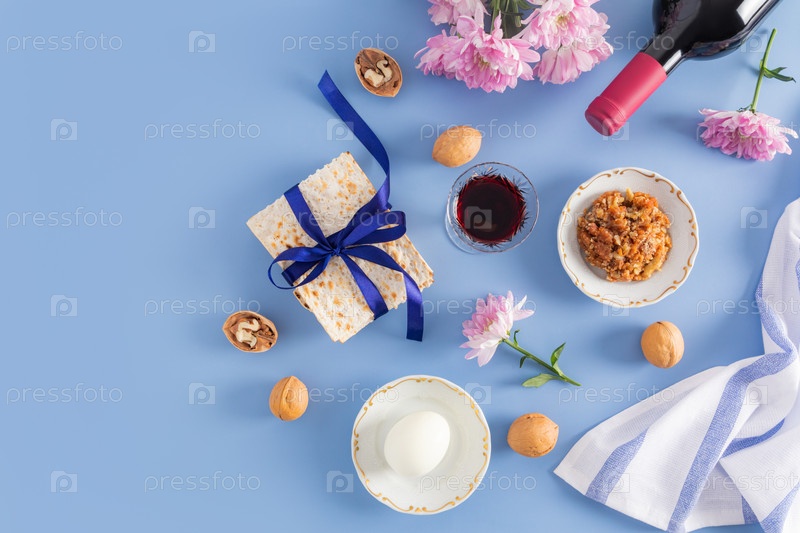 Красивый пасхальный синий фон еврейской пасхи. вид сверху на бутылку красного кошерного вина, бокалы вина, мацу, орехи, яйцо на тарелке
